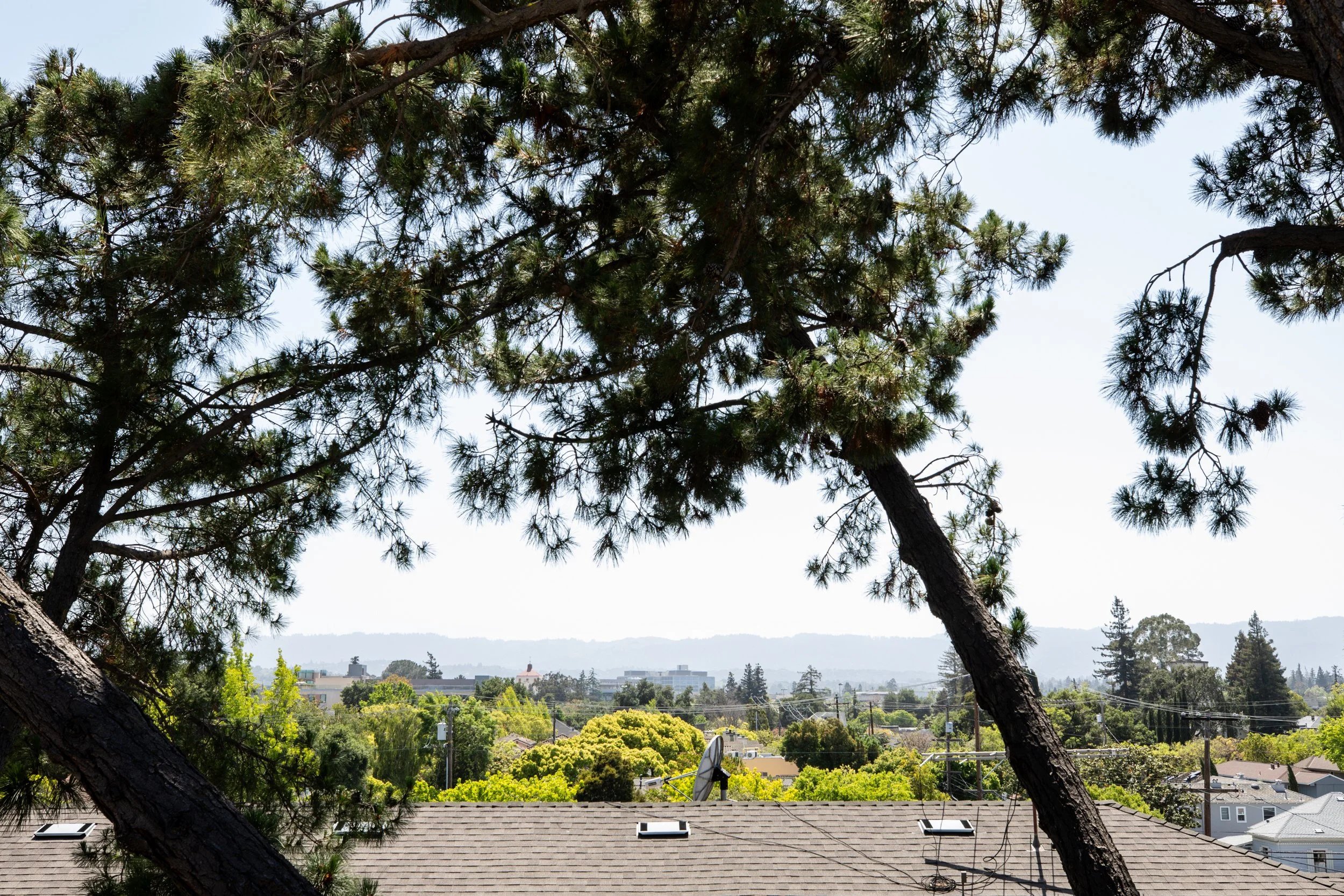 Unit 5 is uniquely located within the complex, with only the penthouse patio above, and features unobstructed views reaching as far as Hoover Tower. From the living room's floor-to-ceiling windows, morning light floods in, and sunsets can be viewed through the treetops. The wraparound deck truly extends your living space, with ample room for seating and dining—private, peaceful, and perfect for indoor-outdoor living.